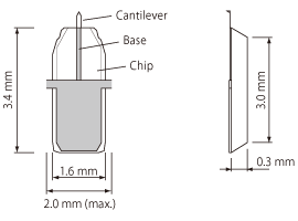 A corner of the triangular protrusion at the end of the bird-beak-like cantilever behaves as a probe tip. The protrusion is a plate-like, 0.8 µm in length and its apex is 24 nm in radius ( nominal ).In taking AFM movies for observing dynamic behavior of bio samples like DNA strands, the protrusions with relatively large tip-apex often result less scratched lines in the images.