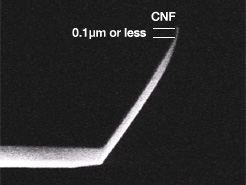A CNF probe, small fibril with a tip radius less than 10 nm, grows at the end of the triangular portion of bird-beak-like cantilever. CNF probe improves quality of AFM images.
