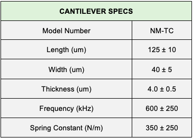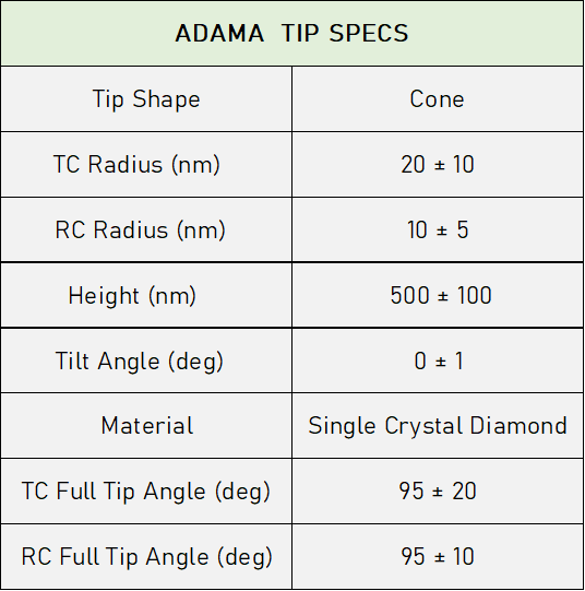 These tips are specifically designed for high mechanical loads and scratch testing applications. By using wear-resistant diamond and a broad cone angle the contact size is well characterized and stays constant during repeated mechanical measurements. These probes are designed for nanoindenation and induce high levels of plastic deformation which allows hem to be used with Oliver-Pharr analysis to measure both the modulus and hardness of materials. These probes have demonstrated highly repeatable deep (~100nm) indentations in fused silica. The high resolution tip apex enables in-situ imaging of indents using the same probe.