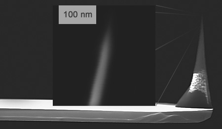 The typical radius of SCD probe is the same as that of silicon AFM tip. An advantage of SCD is that the tip is very durable in any scanning mode and resistant to contamination because of the low surfce energy of diamond. As a result, SCD tip can be used to make many scans, which is especially advantageous when tip relpacement is hard, time-taking, or not compatible with the experiment.