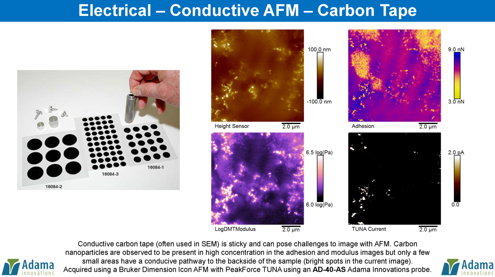 Conductive carbon tape (often used in SEM) is sticky and can pose challenges to AFM image users. Carbon nanoparticles are observed to present in high concentration in the adhesion and modulus images but only a few small areas have a conductive pathway to the backside of the sample (refer to bright spots in the below images). Data acquired using a Bruker Dimension Icon AFM with PeakForce TUNA using an AD-40-AS Adama Innovations probe.