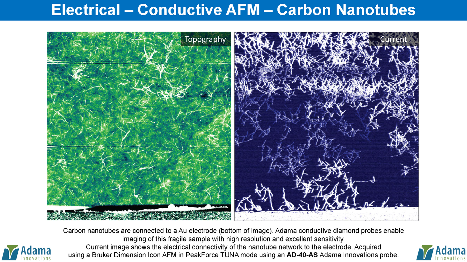 Carbon nanotubes are connected to a Au electrode (see bottom of image). Adama conductive diamond probes enable imaging of this fragile sample with high resolution and excellent sensitivity. Current image shows the electrical connectivity of the nanotube network to the electrode. Data acquired using a Bruker Dimension Icon AFM in PeakForce TUNA mode using an AD-40-AS Adama Innovations probe.