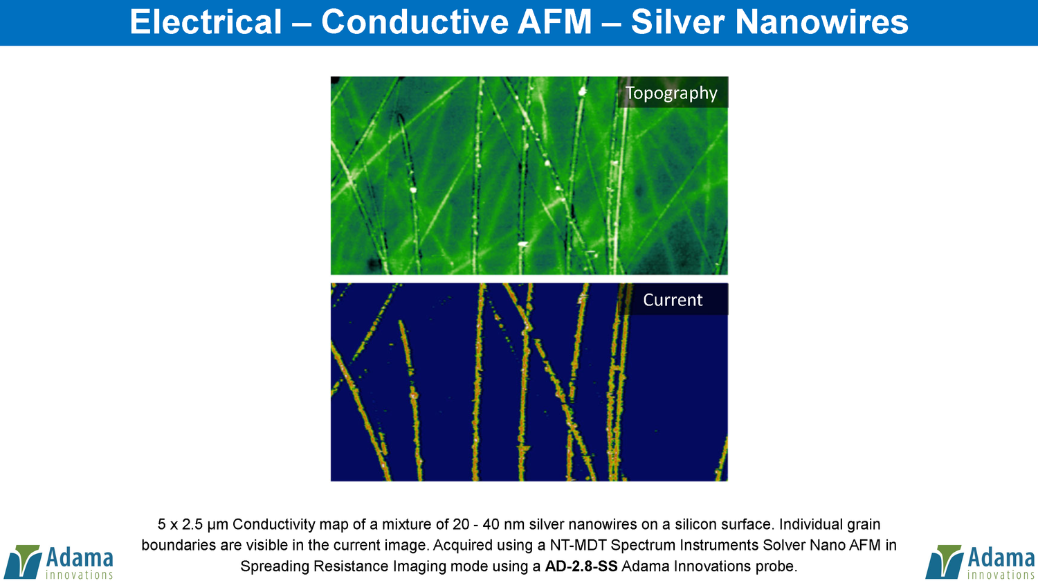 A 5 x 2.5 µm Conductivity map of a mixture of 20-40 nm silver nanowires on a silicon surface. Individual grain boundaries are visible in the current image. Data acquired using a NT-MDT Spectrum Instruments Solver Nano AFM in Spreading Resistance Imaging mode with an AD-2.8-SS Adama Innovations probe.