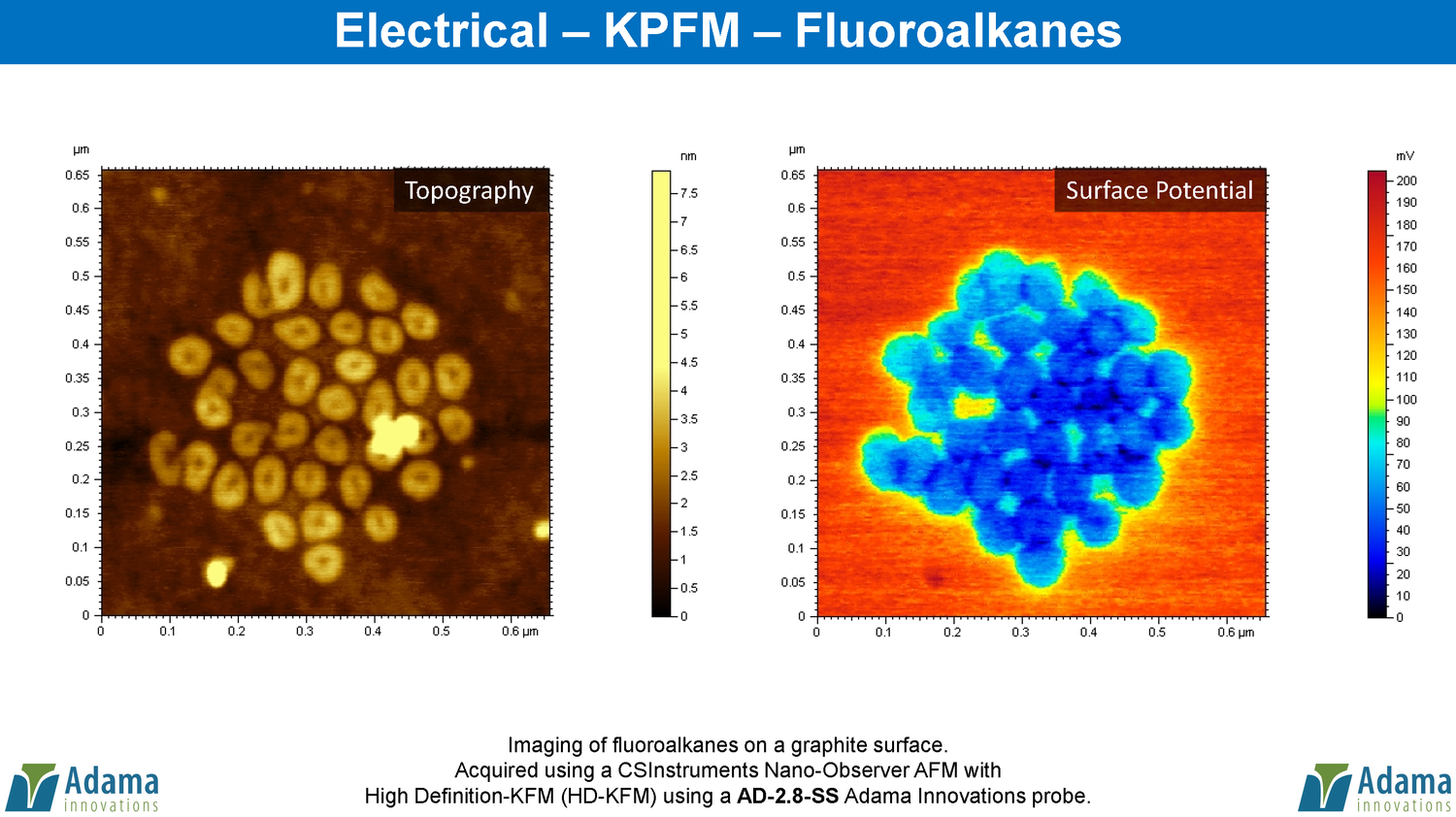 Imaging of fluoroalkanes on a graphite surface. Data acquired using a CSInstruments Nano-Observer AFM with High Definition-KFM (HD-KFM) using a AD-2.8-SS Adama Innovations probe.