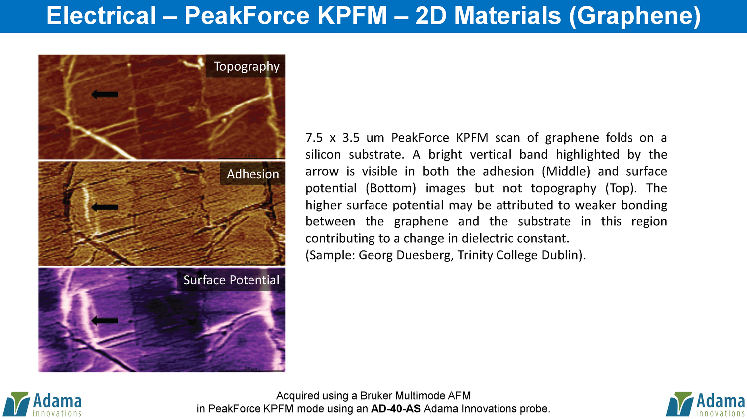 A 7.5 x 3.5 µm PeakForce KPFM scan of graohene folds on a silicon substrate. A bright vertical band highlighted by the arrow is visible in both the adhesion (Middle) and surface potential (Bottom) images but not in topography (Top). The higher surface potential may be attributed to weaker bonding between the graphene and the substrate in this region contributing to a change in dielectric constant.