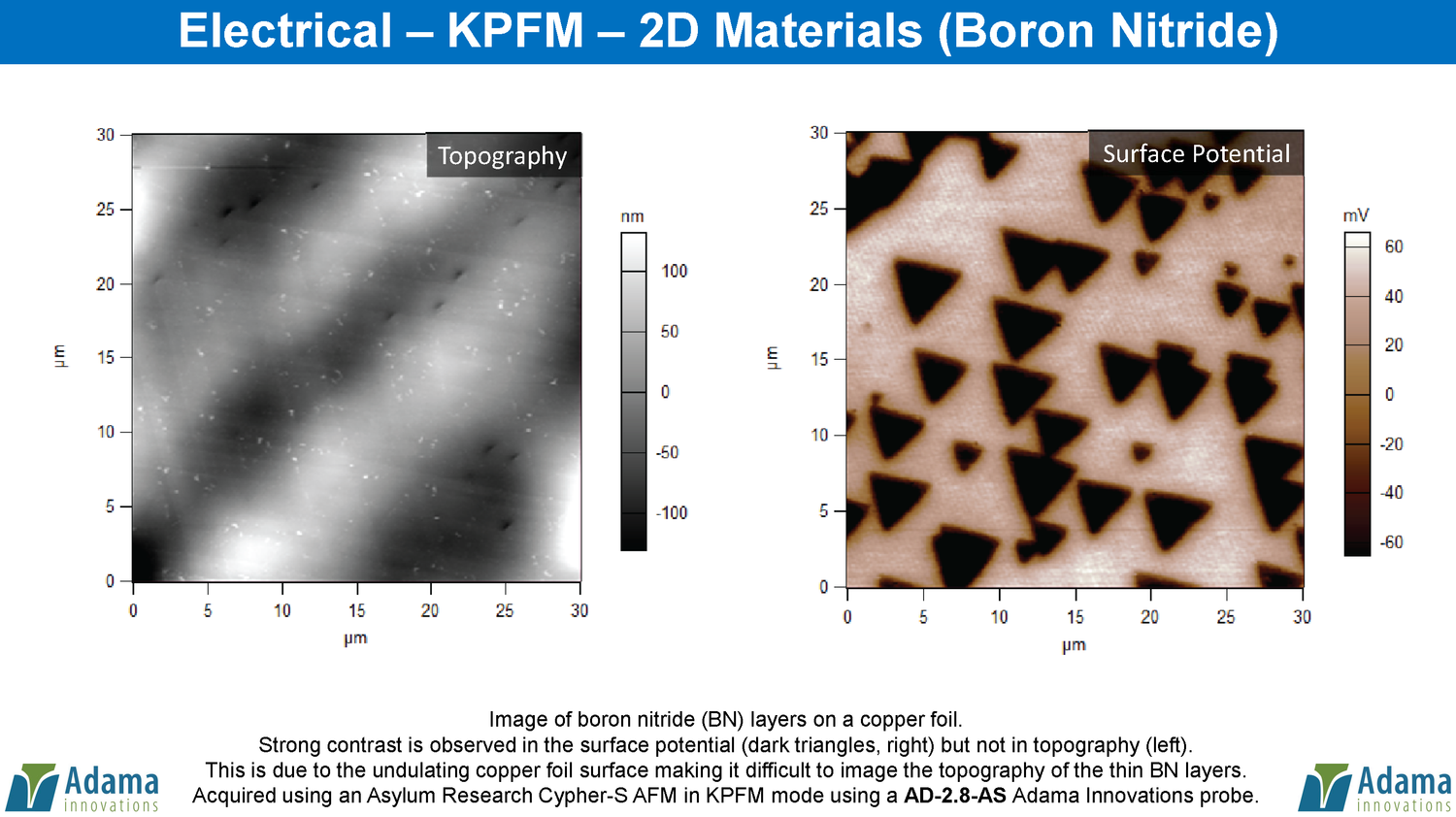 Image of boron nitride (BN) layers on a copper foil. Strong contrast is observed in the surface potenitial (dark triangles, right) but not in topography (right). This is due to the undulating copper foil surface that makes it difficult to image the topography of the thin BN layers. Data acqired using an Asylum Research Cypher-S AFM in KPFM mode using an AD-2.8-AS Adama Innovations probe.