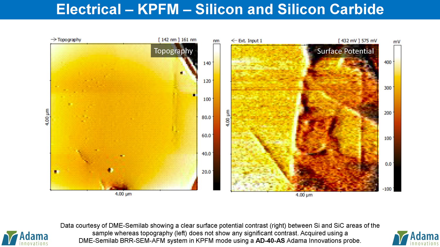 A clear surface potential contrast (Right) bwtween Si and SiC areas of the samoke whereas topography (Left) does not show any significant contrast. Data acquired using a DME-Semilab BRR-SEM-AFM system in KPFM mode using an AD-40-AS Adama Innovations probe.