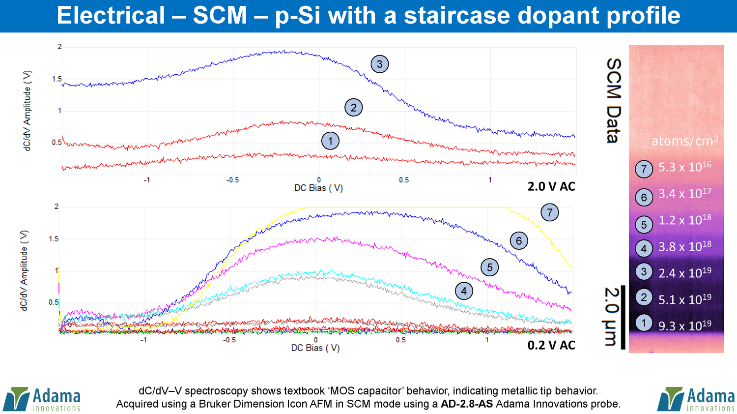 dC/dV-V spectroscopy shows textbook "MOS capacitor" behaviour, indicating metallic tip behaviour. Data acquired using a Bruker Dimension Icon AFM in SCM mode using an AD-2.8-AS Adama Innovations probe.