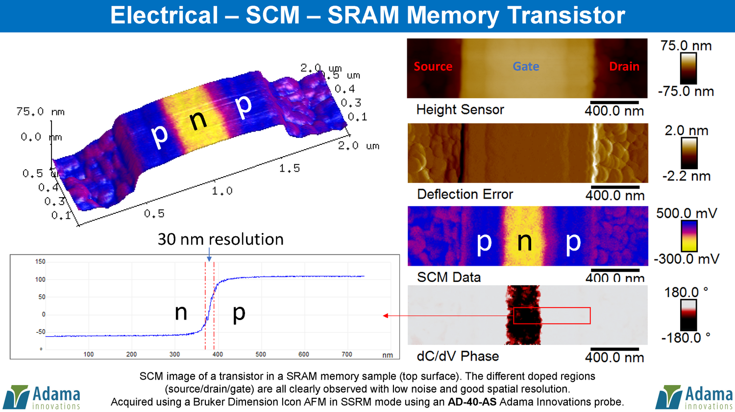 SCM image of a transistor in a SRAM memory sample (Top surface). The different doped regions (source/drain/gate) are all clearly observed with low noise and good spatial resolutoin. Data acquired using a Bruker Dimension Icon AFM in SSRM mode using an AD-40-AS Adama Innovations probe.